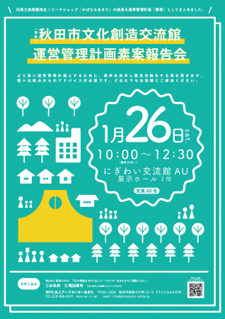 同案について市民からの新たな提案・意見を募る場として、「(仮称)秋田市文化創造交流館 運営管理計画素案報告会」を1月26日(土)に、「秋田市にぎわい交流館」(秋田市中通)において開催します。