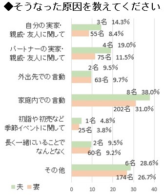 「その他」を除くと、夫・妻ともにもっとも多いのは「家庭内での言動」で、次いで「パートナーの実家・親戚・友人に関して」となりました。そのほか「自分の実家・親戚・友人に関して」「外出先での言動」「長く一緒にいることでなんとなく」など、原因は夫婦や家庭の日常の中にあることが多いようで、「季節イベントに関して」がもっとも少ない結果となりました。 「その他」のフリー回答では、「自分のお客さんなのに他人任せにする」「子どもの世話をしない」「パチンコに行ってしまう」など、「妻任せ」が原因となる意見が多く見られました。中には「宝くじを洗濯物と一緒に洗ってしまった」という回答も。