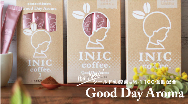お湯や牛乳で溶かすだけで、ドリップしたような本格的なコーヒーが楽しめる「INIC coffee(イニックコーヒー(R))」より、新商品「Good Day Aroma」を2019年1月から販売開始。“シールド乳酸菌(R)M-1”を100億個配合した、美味しいだけではなく、カラダにもうれしい新商品です。