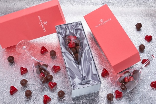 限定100個で発売するのは、シャンパーニュグラスの中に立ち昇る繊細な泡をイメージしたボンボンショコラ。リンゴのブランデー、“カルバドス”を使った手作りのトリュフショコラに、エルダーフラワーが香るグリオットチェリーのガナッシュをあしらいました。トゥールダルジャンのロゴ入りクリスタルグラス付きで、ゴージャスな贈り物におすすめです。