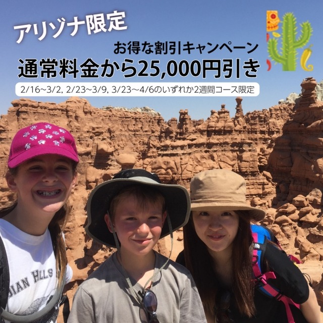 アメリカ アリゾナ州の小学校で教師体験を行い、現地の一般家庭にホームステイをする2週間のプログラムに参加される方限定で、通常料金から25,000円をお値引きします。