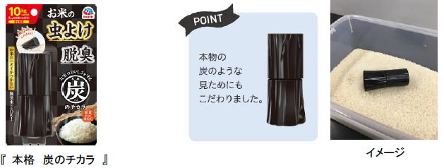米びつ防虫剤を購入する際の重視点を調べてみると、虫よけ効果以外に、ニオイや成分に対する安心感のニーズも多いことがわかっています(自社調査)。また、お米のおいしさとの親和性が高いものとして「炭」をイメージすることもわかっています。 当社では、お米のニオイが虫を誘引する一因になる点やお米が外部からの臭いを吸収しやすい点に着目し、成分にもこだわり、製品開発を行いました。