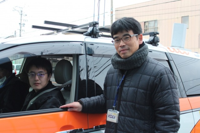 <写真1:5Gの自動運転車両のシステム監視者を担当した埼玉工大の大学院生と渡部教授>