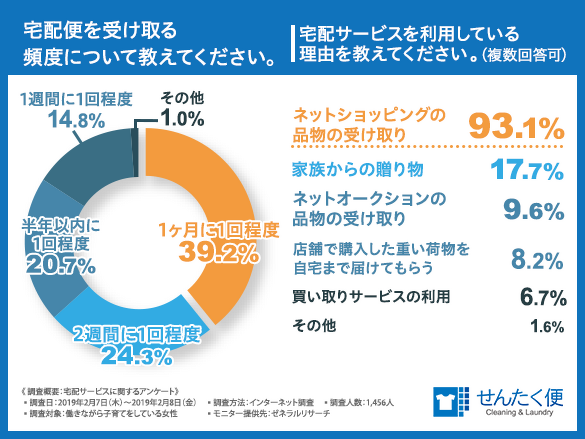 1ヶ月に1回は宅配サービスを利用すると回答した方の割合は半数以上となり、利用する理由としてはそのほとんどが『ネットショッピングの品物の受け取り』であることがわかりました。