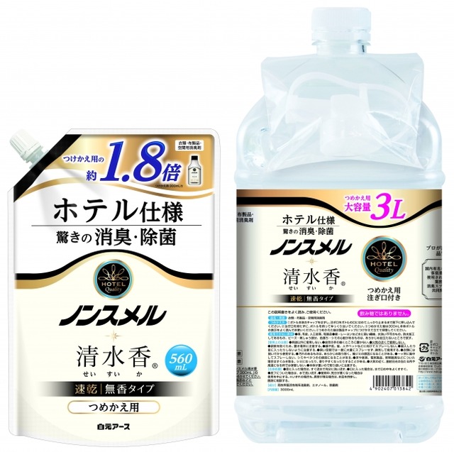 白元アース株式会社(本社:東京都 台東区、社長:吉村一人)は3月1日より、衣類・布製品・空間用消臭剤『ノンスメル清水香(せいすいか)』に「つめかえパウチ560mL」を新発売、「つめかえ大容量3L」を限定発売いたします。