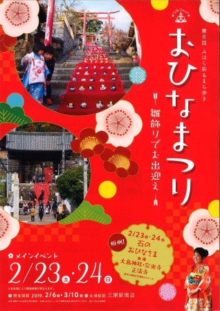 第6回「みはら彩る町歩き おひなまつり」を、2019年2月6日(水)から3月10日(日)の間開催しております。期間中三原駅周辺ではひなかざりが行われ町全体が華やかな雰囲気に。2月23日(土)、24日(日)は特別企画として、大島神社・宗光寺・正法寺にて「石のおひなさま」が飾られます。可愛らしいおひなさまの写真はインスタ映え間違いなし!また、三原のまちあるきを着物姿で楽しんでもらえるよう、着物レンタルや着付け、撮影会などのイベントも開催されます。参加人数には限りがございますのでお早目のお申し込みをお願いいたします。この機会に是非着物で三原のまちあるきを楽しんでみてください。