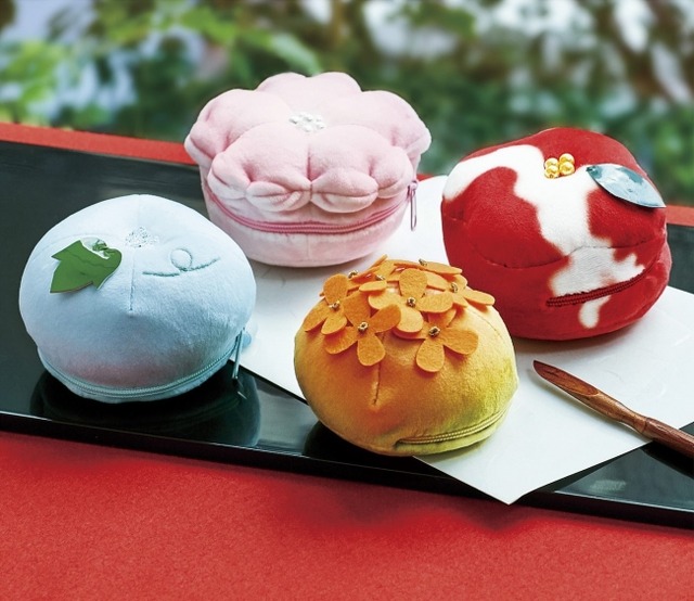 日本の四季折々のモチーフを美しく表現する和菓子の“練り切り”が、かわいさあまってポーチになりました。デリケートで日持ちせず食べるのがもったいないと感じる練り切りを、食感ならぬ触感がいつでも楽しみいただける、もっちりふっくらとした素材で仕立てています。見て触って、和の装いのお出かけのアクセントとして、和雑貨好きな方へのプレゼントにもお勧めです。デザインは4種類。左から〈桜の練り切り〉〈朝顔の練り切り〉〈金木犀の練り切り〉〈寒椿の練り切り〉です。