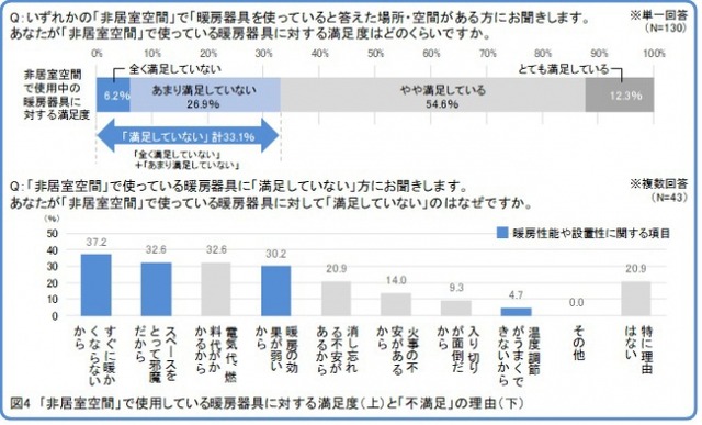 いずれかの非居室空間で「暖房器具を使っている」と答えた場所・空間がある方に、非居室空間で使っている暖房器具に対する満足度を聞いたところ約3割(33.1%)の人が「満足していない」(「全く満足していない」と「あまり満足していない」の合計)と回答しました(図4・上)。不満足の理由としては「すぐに暖かくならない」、「スペースをとって邪魔」、「暖房の効果が弱い」といった声が上位に上がっています(図4・下)。非居室空間における「温度差」、「寒さ」対策としては、性能と設置性を両立した暖房器具が求められているといえそうです。