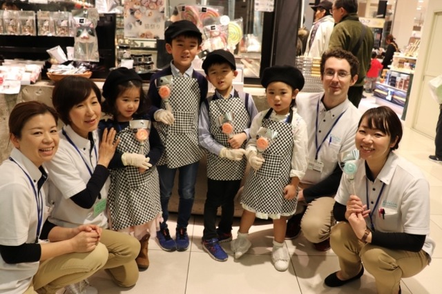 2019年2月17日(日)、大丸松坂屋百貨店を運営するJ.フロントリテイリンググループのバイリンガル幼児園「Daimaru Matsuzakaya Kids Duo International青葉台」の今春入園予定園児と卒園生が、大丸東京店のPAPABUBBLE(パパブブレ、アート・キャンディ・ショップ)で、得意の英語を使って職業体験をおこないました。