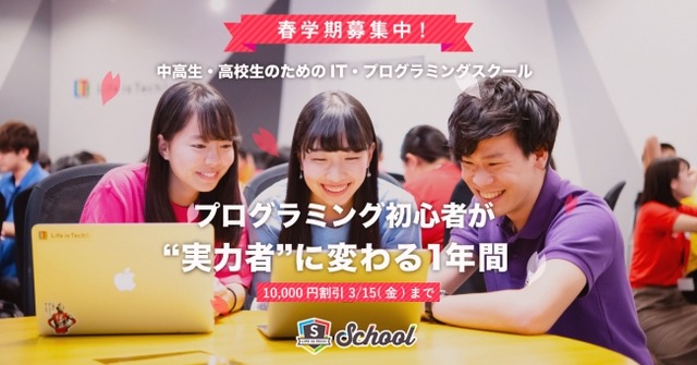 ライフイズテック株式会社(本社:東京都港区、代表取締役 CEO:水野 雄介)が運営する中学生・高校生のためのプログラミングスクール「Life is Tech ! School(ライフイズテック スクール)」は、本日より2019年春学期の受講生募集を開始しました。