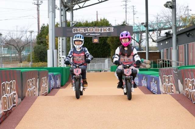 3月21日(木・祝)の新機種グランドオープンに先がけて登場するこのアトラクションは、日本初*の本格モトクロスバイクアトラクション「アクロバイク」と、1人でバイクに乗る挑戦が楽しめる「キッズバイクトレーニング」、3歳からバイクの楽しさを体験できる「ピンキーバイクプラス」の3機種です。