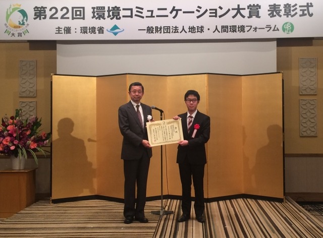 2月20日に行われた表彰式に環境ISO学生委員会の環境報告書編集部の学生4名が参加し、編集長の浅輪光(文学部3年)が代表して登壇し、受賞しました。