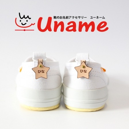 ユーネームは「園生活がたのしくなるような靴グッズをつくりたい!」という想いから企画した、靴屋さんがつくった子ども靴専用のネームタグ。保育園や幼稚園の上履きはもちろん、かかと部分にベロがついたスニーカーなどのシューズにもつけることができます。