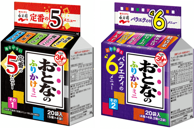 株式会社 永谷園(社長:飯塚 弦二朗、東京都港区)は、おとなのふりかけ発売30周年を記念して、メニューを大幅に刷新した「おとなのふりかけミニ その1」「同 その2」を(税抜238円)を、2019年3月4日(月)より全国で発売いたします。日常使いに便利な王道5メニューがそろった「その1」、お弁当利用にうれしい彩りとバラエティ豊かな6メニューをそろえた「その2」と、利用シーンに合わせて選べるラインナップになっているので、自宅でも外出先でも毎日違ったおいしさをお楽しみいただけます。