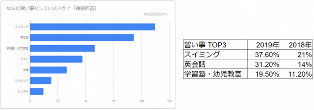 2018年の調査結果に続き、「スイミング」を習っているという回答が37.6%と最も多い結果となり、昨年の21%と比較すると、16.6%増加した。2番目に多かった「英語」は、昨年の倍以上である31.2%に増加しており、「学習塾・幼児教室」についても、昨年の11.2%からおよそ1.5倍の19.5%が習っていると回答。スイミングによる体力作りに加え、2020年度より施行される新学習指導要領における「英語の教科化」の影響からか、子どもの学力を気に掛ける傾向があった。