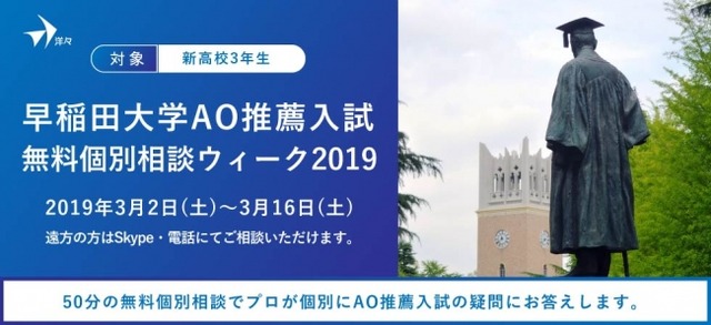 AO入試・推薦入試・小論文対策の個別指導を手がける洋々(本社所在地:東京都渋谷区)は、早稲田大学の AO推薦入試の受験を検討されている受験生および保護者の方を対象とした「プロが答える!早稲田大学 AO推薦入試 無料個別相談ウィーク」を2019年3月2日(土)~2019年3月16日(土)の期間で開催します。