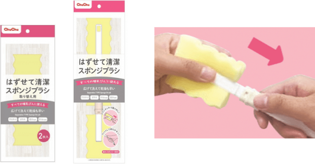 「はずせて清潔 スポンジブラシ」は、すべての哺乳びんにお使いいただける哺乳びん洗い専用スポンジです。スポンジと柄が密着している部分のよごれを気にされる方のためにワンタッチで簡単にスポンジを取り外せる仕様になっています。スポンジ本体をキレイに洗えて乾燥も早く、とっても清潔です。
