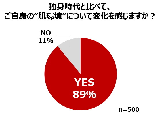 まず、「独身時代と比べて、ご自身の“肌環境”について変化を感じますか?」と聞いたところ、89%が「感じる」と回答。「ストレスを感じる時間が増えた」(85%)、「紫外線を浴びる時間が増えた」(72%)、「睡眠時間が減った」(71%)など、ママたちはさまざまな面で変化を感じているようです。