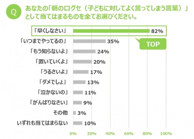 また、ママたちに「朝の口グセ(子どもに対してよく言ってしまう言葉)」を聞いてみると、「早くしなさい」が82%で圧倒的に多い結果となりました。そのほかに、「いつまでやってるの」(35%)、「もう知らないよ」(24%)、「置いていくよ」(20%)などが口グセとなっているママも多いようです。