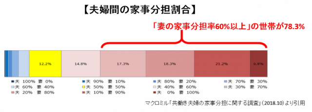 男女間の家事分担の不平等は顕著で、夫婦ともにフルタイムの共働き夫婦のうち、夫より妻の家事負担率が高い世帯は78.3%に上ります(下図参照)。家事は女性がするもの、という価値観が背景にあり、女性が家事を抱え込みがちになっていると考えられます。