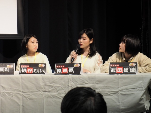 今回、ニコニコ動画のインターネット配信では1万2000人強が視聴。歌人の栗木京子さん、穂村弘さん、小島なおさんが判者となり、8チーム各3人が精魂を込めた短歌の真剣勝負にしのぎを削った。
