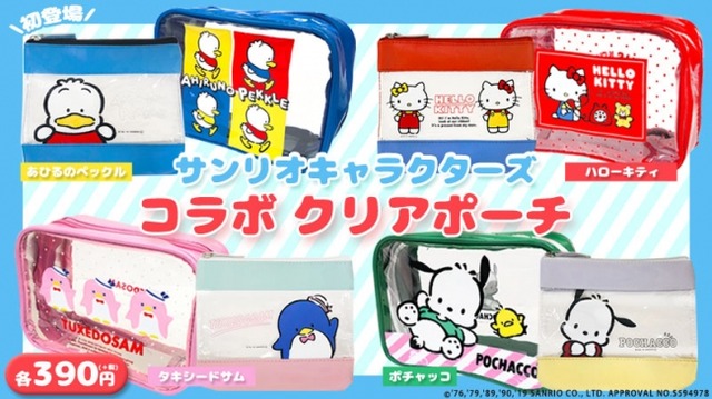 今回発表するコラボ新商品では、『ハローキティ』『タキシードサム』『ポチャッコ』と一緒に『あひるのペックル』が初登場!普段使いから旅行まで様々なシーンで大活躍間違いなしのクリアフラットポーチ・スクエアポーチをお届けいたします。