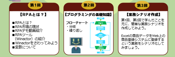 カリキュラムは、第1日がRPAの概念やRPAツールの紹介とハンズオン、第2日がフローチャートなどプログラミングの基礎知識の習得、第3日は業務シナリオ作成に取り組み、エクセルの商品データをウェブ上の商品登録システムに登録する業務をシナリオ化します。