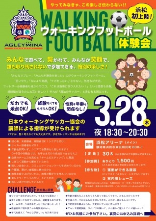 2019年3月28日(木)、浜松アリーナ(静岡県浜松市)にて日本フットサルリーグ(Fリーグ)アグレミーナ浜松(本拠地/静岡県浜松市)がウォーキングフットボール体験会を開催します。浜松初上陸のウォーキングフットボールは「経験値が違うのにお互いに楽しい」、新しい概念のスポーツです。