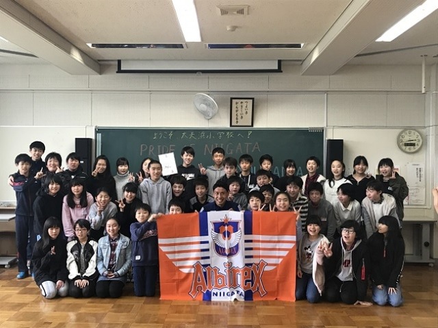 今日の午後、ホームタウン活動としてトップチーム選手による小学校訪問を行いました。訪問校の卒業生である選手が訪問させていただけることとなり、平松宗選手は新潟市立太夫浜小学校、渡邉新太選手は新潟市立真砂小学校、藤田和輝選手は新潟大学教育学部附属新潟小学校を訪問しました。
