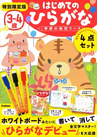 ひらがなにあまり興味のないお子さんでも、楽しんで取り組めると人気のワークブック『3~4歳 かいてけせる ひらがな』に、すぐに学習を始められる3アイテムをプラス! お子さんが楽しく学べるようにという編集部のこだわりがつまった、数量限定の「ひらがな学習スタートセット」です。