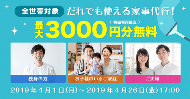 キッズラインの家事代行の手軽さを多くの方にご体験いただけるよう、キッズラインを初めてご利用いただく方に最大3000円分のポイントをプレゼントするキャンペーンを開催いたします。