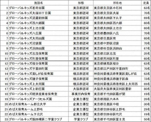 新たに開設した施設の内訳は、認可保育所17施設、事業所内保育施設1施設、企業主導型保育事業4施設、学童クラブ1施設。これにより、グローバルキッズが運営する保育施設数は165施設になります。