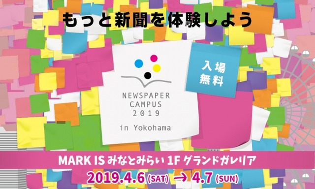 日本新聞協会は、春の新聞週間にあわせて4月6日(土)~7日(日)の2日間、横浜市の商業施設MARK IS みなとみらいで「NEWSPAPER CAMPUS 2019 in 横浜」を開催します。