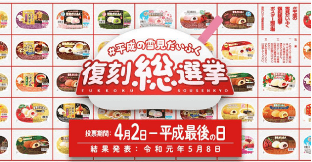 この度、新元号「令和」が発表され、平成も残り1ヶ月を切った今、新たな時代になっても、雪見だいふくの変わらぬおいしさをみなさまにお届けしていきたいという想いから、『#平成の雪見だいふく復刻総選挙』を開催いたします。