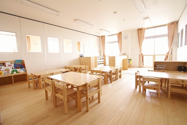 自然素材を用いた明るい保育室では、子どもたちが自分の居場所と感じられる環境や、想像力を発揮してのびのびと過ごせる環境づくりをしております。毎日の生活の中で国産間伐材のヒノキをふんだんに使用した家具や手づくりおもちゃの暖かな感覚に触れながらのびやかに過ごしてほしいと願っております。