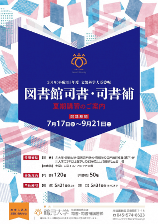 学校法人 総持学園 鶴見大学・鶴見大学短期大学部(所在地 神奈川県横浜市鶴見区鶴見2-1-3)では、2019(平成31)年度図書館司書・司書補夏期講習の募集を開始いたしました。