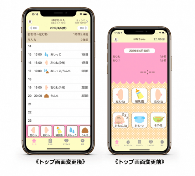 ・赤ちゃんのお世話の記録アプリ『授乳ノート』のトップ画面を2019年4月8日(月)より変更