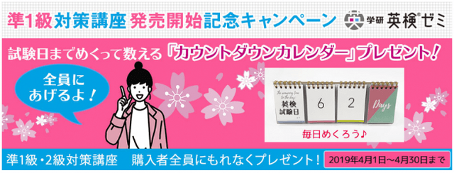 株式会社 学研ホールディングス(東京・品川/代表取締役社長:宮原博昭)のグループ会社、株式会社 学研プラス(東京・品川/代表取締役社長:碇 秀行)は、映像授業+テキストで学習する「学研英検(R)ゼミ<準1級対策講座>」の発売を記念して、2019年4月30日(火)までに準1級講座・2級講座をご購入いただいた方全員に、試験日までめくって数える「カウントダウンカレンダー」プレゼントを実施中です。