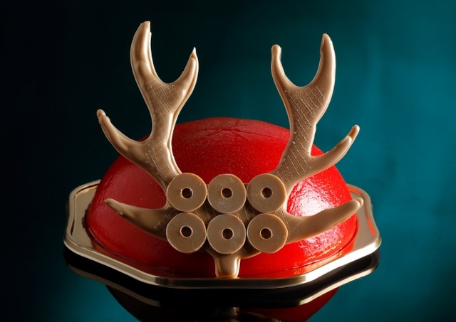 戦国武将 真田幸村の兜をイメージした重厚感のある兜形のケーキです。いちごのコンポートとジュレ、ピスタチオのスポンジケーキを層にし、マスカルポーネのクリームで覆い、赤いグラサージュで仕上げました。