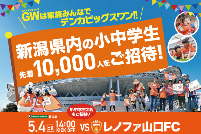 ※新潟市内の小中学生は“保護者も招待となる”新潟市ドキドキ・ワクワクスポーツふれあい促進事業(https://www.members.jleague.jp/members/auth/index/AN/20159_jvdb_138?cid=mkdbRpMini)からお申し込みください。