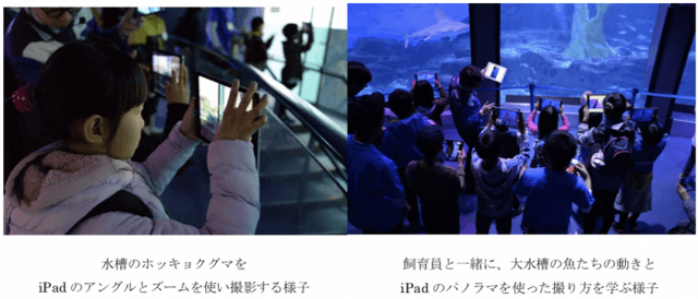 飼育員が紹介する海の生きものの特徴的な動きについて、興味深々な子どもたち。生きものの動きを観察しながら、iPadのアングル、光調整、ズーム、パノラマの機能を使って、たくさんの生きものたちの決定的瞬間を思い思いに撮影いただきました。47名のお子さまそれぞれのクリエイティビティが発揮された、オリジナルの作品が完成しました。