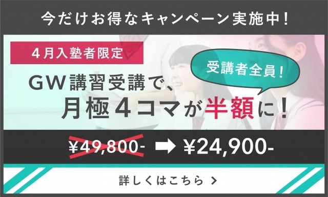 新規塾生限定!4月中に入塾されGW講習受講者された方を対象に、授業料を半額でご提供します。