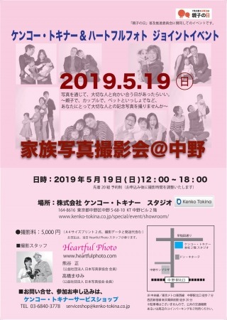 株式会社ケンコー・トキナー(本社:東京都中野区、代表取締役社長:山中 徹)は、家族の絆をテーマに結婚、子ども誕生、親子の写真の撮影を行っている「Heartful Photo」による「家族写真撮影会」を開催。開催日時は2019年5月19日(日)。ケンコー・トキナーサービスショップ内撮影スタジオにて実施いたします。撮影料は5,000円、先着20組まで予約受付をいたします。