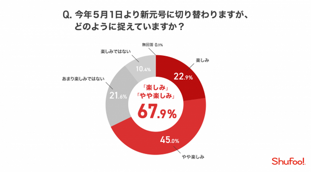 改元について、「楽しみ」「やや楽しみ」と回答した割合は67.9%となりました。大多数が新しい元号を楽しみにしていることが伺えます。理由として、「新しい時代に突入する」「気持ちを新たに生活出来そうな気がする」など「新しい=ワクワクする」という方が多くいました。「生まれてくる子が新元号生まれになるから」など、“元年ベイビー”ママの喜びの声もありました。