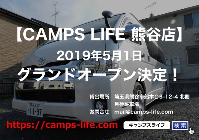 この度、キャンピングカーシェアのCAMPS LIFE(キャンプスライフ)を運営するCAMPS LIFE JAPAN合同会社は、埼玉県熊谷市船木台に2019年5月1、新たに熊谷店をオープンいたします。