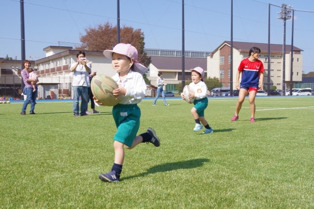 また、「ラグビー教室」では安全で広い敷地を利用し、思いっきり走るなど本来子ども達に必要な要素をふんだんに活用し、外で遊ぶ楽しさを伝えたいと考えます。また、実際にボールを扱った練習等を通して、ボールに親しみ、空間把握能力や走力の増進、友達同士で協力して取り組む協同性を養うことを目的としています。