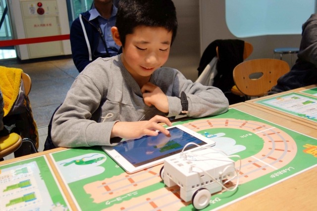 事前に組み立てられた「列車」を紙の線路に合わせ、「まっすぐ走った後、曲がる」、「○○駅で止める」といった、モーターを制御する初歩的なプログラミングに挑戦していただきます。