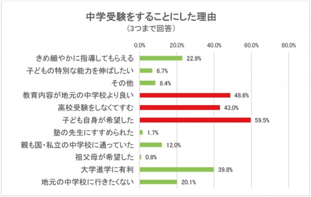 中学受験をすることにした理由を、選択肢から3つ選ぶ質問では、「子ども自身が希望した」353人(59.5%)、「教育内容が地元の中学校より良い」288人(48.6%)、「高校受験をしなくてすむ」が255人(43.0%)でした。「大学進学に有利」と回答した人も、236人(39.8%)いました。[画像1: https://prtimes.jp/i/21716/110/resize/d21716-110-687058-0.jpg ]