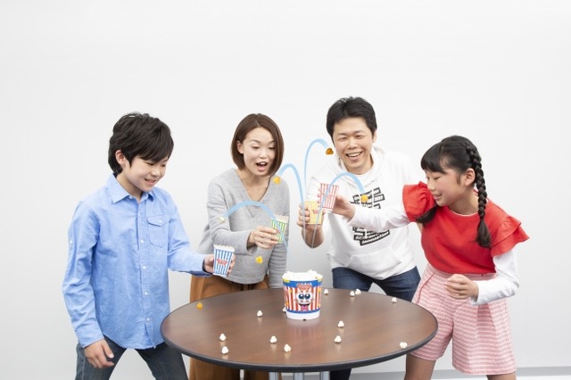 本商品は、飛び出すポップコーンパーツをキャッチして、獲得ポイントが一番高い人が勝ちとなるシンプルなルールのもと楽しめるパーティーゲームです。
