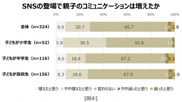 親子の1日あたりの会話時間は、「30分~1時間未満」が最も多く、子どもが大きくなるにつれて会話時間は少なくなっていくことがわかりました。[図1.] 子どもの携帯電話所有率は、小学生は38.5%、中学生は69.5%、高校生は93.5%で[図2.]、子どもが携帯電話を持っている親子の1日あたりのSNS(LINE・Twitter・Facebook・Instagramなど)でのメッセージやメールのやりとりの回数は「3回未満」が最も多いという結果に。[図3.] SNSの登場で親子間のコミュニケーションは増えたかと聞いたところ、「変わらない」と答えた親(65.7%)が最も多く、子どもが小学生の場合には42.3%の親が増えた(「増えた」5.8%+「やや増えた」36.5%)と答えました。[図4.] SNSがコミュニケーションの活性化に一役買っている側面もあるようです。